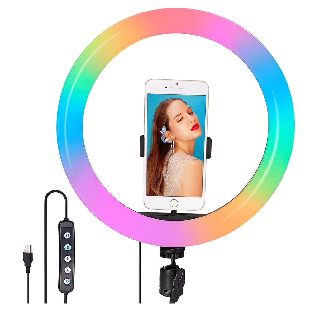 Optimiza tus sesiones de fotografía y video con nuestro Trípode 2.1M con Aro de Luz RGB de 10″. Con un diámetro de 26 cm, este aro permite ajustar la potencia de luz y elegir entre colores RGB fríos, cálidos y neutros para lograr la iluminación perfecta.
